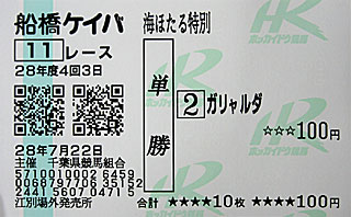 先程と同じく、記念に 船橋競馬の 海ほたる特別の馬券を買ってみる。 馬券には印字されたのは「 江別場外発売所」。 |