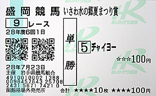 せっかくなので、記念馬券も購入。 今日は道営開催がないため、盛岡競馬の いさわ水の郷夏まつり賞、 ばんえい帯広競馬の ユリウス特別、さらにJ-PLACEの函館11R 函館日刊スポーツ杯。 いずれも発売箇所は「 函館港場外発売所」と印字されました。「町」はどこいった!? |
