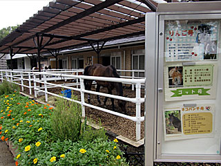 引き続き 台風10号が接近中の 東京競馬場ですが、昨日とは違って雨は時折ぱらつく程度。 昨日、雨のため展示が中止されていた 乗馬センターですが、今日は ネコパンチ、 ディオス、 りんごの3頭がくつろいでいました。 |