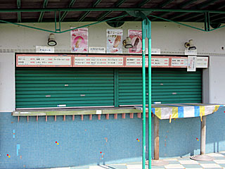 さらに内馬場の 「ファミリーゾーン売店(アンビシャン12号店)」も塗りつぶされてるのに気付く。 早速、確認しに行ってみたが、メニュー等はそのまま掲示されている状態。 この店、パークウインズでも開いていたり閉まっていたりするので、閉店したのか、今日は営業してないだけなのかは不明。 閉店したはずの 「ひといき茶屋」がグルメマップ上に残っているので、ただ単に貼り間違えたという可能性も… |  |  |