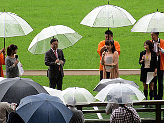 初日のメインは サウジアラビアロイヤルカップ。 その誘導を務めたのは オメガオンリーワン、 キモンホワイト、 ストラディヴァリオでした。 ちなみに朝からの土砂降りは、午後になって上がりました。 |