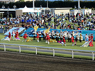 いよいよJBCの開幕を告げる生ファンファーレ! しかし、ファンファーレ隊の後ろには、なにやらのぼりを持った警察官が… 今からダート日本一を決めるというビッグレースの演出がこれ? JBCというイベントや、競馬というスポーツをどう捉えているのか疑問。 国体の開会式や、日本シリーズの始球式でも、このようなのぼりを掲げるのか?ということ。 |