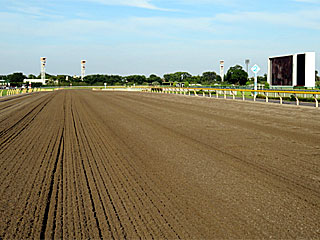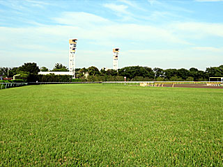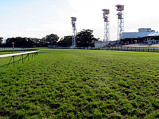 そのまま1コーナー方向へ。 逆光になると、芝のボコボコが非常に目立つ。 本馬場を堪能し、ここから出口へ。 |