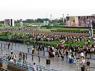 最終レース終了後の16:45より芝コース開放イベント! まずは4コーナー方向へ。 外ラチ沿いと内ラチ沿いの芝を観察。 芝コースは例年より痛みが激しいという印象。 |