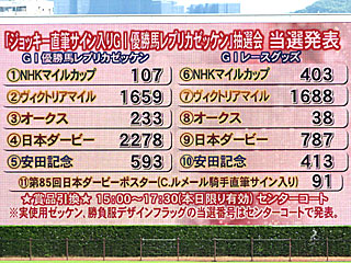 また、こちらも同じく恒例の「 GⅠ優勝馬レプリカゼッケン抽選会」も行われました。 応募はしたものの、今年もやっぱり当たらず… |