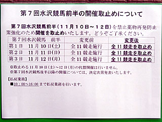 10/28の盛岡競馬出走馬から禁止薬物が検出されたと、岩手県競馬組合から11/6に発表がありました。 禁止薬物の検出は7月、9月に続き、今年3度目で、いずれも第3者によって投与された可能性が高く、さらなる対策を講じる必要があるため、11/10~12の水沢競馬は開催取り止めとなりました。 それにともない、 東京競馬場の 岩手競馬場外発売所では、今日明日の2日間、払戻業務のみ行われています。 |