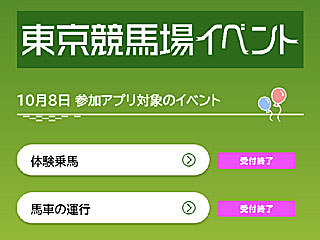 今秋登場した「 競馬場イベント参加アプリ」も今日から 東京競馬場での運用が始まりました。 混雑が見込まれるような場内イベントは、このアプリで当選した人のみ参加できるようにしたもので、アプリは位置情報で場内にいる場合でしか起動しないようになっています。 今まで先着順だった「 体験乗馬」や「 馬車の運行」も、このアプリで当選した人のみ参加できるようになったようです。 また、イベント参加のための抽選アプリなので、例えば来週行われる「 秋の彩り抽選会」は、アプリで抽選を行い、当選した人だけが抽選会に参加できるという二段階の抽選会になるようです。ややこしい… |