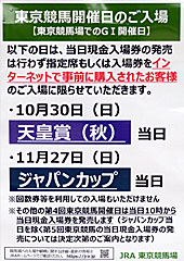 春開催まで、指定席券および立見入場券はインターネットによる事前発売のみでしたが、今秋から当日の窓口発売および回数券でも入場可能となりました。 ただし、当日発売および回数券での入場は10:00以降で、GⅠ開催当日はインターネットによる事前発売のみというルールになっています。 入場門には10:00前から、入場券を持っていないファンの長い列も見られました。 |