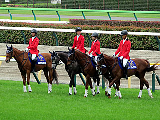 また、本日の 誘導馬。 メインレースを担当したのは ショウナンライズ、 オメガブルーム、 マイネルラクリマ、 クリプトグラムでした。 オメガブルームは最近誘導馬デビューした馬で、頭絡に初心者マークが付いていました。 |