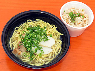 まずは「 琉球キッチンこだま」という店で「 八重山そば」800円、「 ミニじゅーしー」300円。 八重山そばは沖縄そばとは異なる八重山地方のそば。おいしい! また、 じゅーしーは沖縄風炊き込みご飯。これもおいしい! |