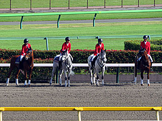 本日の 誘導馬。 メインレースを担当したのは ショウナンライズ、 シュガーヒル、 ミライヘノツバサ、 クリプトグラムでした。 |