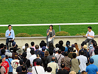 最終レース終了後、スタンド前特設ステージにて「 NHK「優駿のふるさとは未来へ」スペシャルトークイベント」と題したトークショーが行われていました。 出演はビッグレッドファームの 岡田紘和さん、声優の 上田瞳さん、NHKの 白崎義彦アナウンサーとのこと。 |