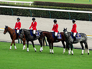 本日の 誘導馬。 メインレースを担当したのは ショウナンライズ、 オメガブルーム、 ムイトオブリガード、 サトノソルタスでした。 |