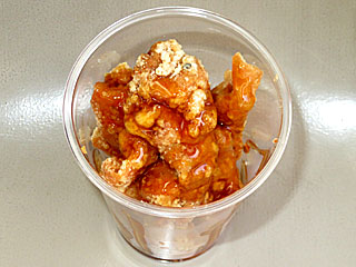 さらに 内馬場の 「華鳥」にも立ち寄る。 「 中津からあげ甘酢かけ」を注文。 中津からあげ5個に甘酢ダレをかけたもので、これはこれでおいしい! ただ、普通に 中津からあげはパックでの提供でしたが、甘酢かけの場合はタレがこぼれないようプラカップ? |