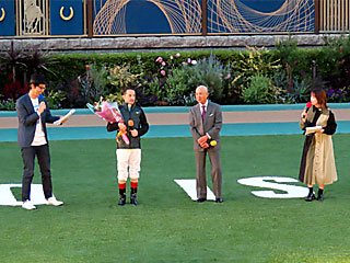 最終レース終了後、パドックで「 天皇賞秋レース回顧」が行われました。 イベントに登場したのは キャプテン渡辺さん、 C.ルメール騎手、 岡部幸雄さん、 津田麻莉奈さんの4人。 岡部さんがレース回顧イベントに登場するとはビックリ! |