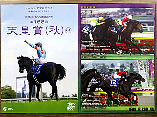 今日の レーシングプログラムは競馬法100周年を記念した特別版。 裏表紙には過去の 天覧競馬で天皇賞を制した2005年 ヘヴンリーロマンスと 2012年エイシンフラッシュになっていました。 |