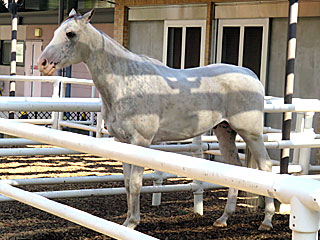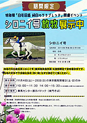 11/4~2/18に JRA競馬博物館で特別展「 白毛図鑑純白のサラブレッド」を開催。 それに合わせて、阪神競馬場で繋養されている シロニイが11/4~26の間、白毛馬の実馬展示として 東京競馬場へ来場し、 乗馬の展示コーナーで10:00~11:30と14:00~15:30の1日2回、時間を区切って公開されていました。 実馬展示というのは今までになく画期的な企画! そして、もともと人気馬でもあり、ものすごい人垣ができていました! |  |  |