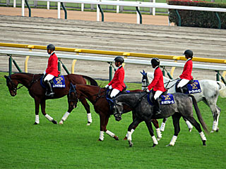 本日の 誘導馬。 メインレースを担当したのは ムイトオブリガード、 シークレットパス、 マイネルラクリマ、 オメガブルームでした。 |