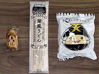 せっかくなので「オロロンの街」200円、「とままえ潮風うどん」300円、「天塩しじみラーメン」500円を購入してみる。 |  |  |