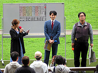 昼休み、 ゴール前特設ステージにて「 東京中日スポーツ熱中予想検討会」が行われました。 出演は 小泉恵未さん、 キムラヨウヘイさん、 若原隆宏さんとのこと。 |