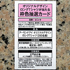 そして「 競馬場イベント参加アプリ」にアクセスしてみたところ「 オリジナルデザインロングTシャツが当たる枠色抽選会」の参加権が当選! ただ、抽選会場にて枠色抽選カードを受け取ったら8枠桃色だった。 1枠白以外は全てハズレだと確信しているので、貰った瞬間にガッカリ… |
