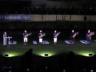 あたりも真っ暗となり、最後にパドックで「 アーモンドアイ関係者トークショー」が行われました。 司会は 岡部玲子さんで、ゲストは馬主代表の 米本昌史氏、 国枝栄調教師、主戦を務めた C.ルメール騎手、シンザン記念で騎乗した 戸崎圭太騎手、コロナ禍に調教で騎乗していた 三浦皇成騎手。 |