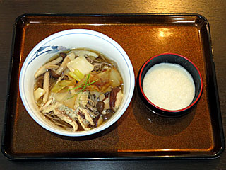 朝メシは フジビュースタンド6Fにある 「ときわ家」へ。 朝限定メニューに新しく登場した「 鶏南蛮そば」を注文。 鶏肉、シメジ、シイタケ、ネギなどの具材がたっぷりで、鶏の出汁も効いたそばはおいしかったし、さらにとろろ付き。 ただ、もともと熱々というわけではなく、とろろを投入して山かけにすると、さらにつゆの温度が下がり、ちょっとぬる過ぎだなぁという感じ… |
