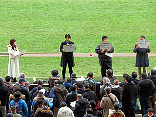 昼休み、 ゴール前特設ステージで「 スポーツ報知根岸ステークス予想検討会」と題したトークショーが行われました。 出演は 田中歩さん、 大上賢一郎さん、 角田晨さん、 馬トクさんとのこと。 |