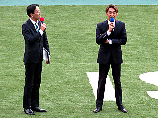 その後、 パドックで「 オートレーサー森且行トークショー」が行われました。 出演は 吉原完アナと、オートレーサーの 森且行選手。 ちょっと珍しく、パドックを周回しながらのトークショーとなりました。 |