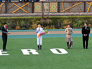 フェブラリーステークスの表彰式。 プレゼンターとして来場していたのは、 東京オリンピックで兄妹揃って柔道金メダリストとなった 阿部一二三さんと 阿部詩さん。 |