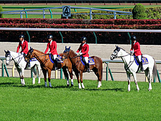 メインレースの 誘導馬。 今日は ミライヘノツバサ、 マイネルホウオウ、 マイネルラクリマ、 ハヤブサナンデクンの4頭が務めていました。 |