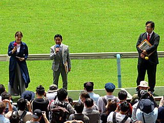 昼休み、ゴール前特設ステージで「 東京中日スポーツ熱中予想検討会」と題したトークショーが行われました。 出演は 小泉恵未さん、 熊沢重文元騎手、 若原隆宏さん。 |