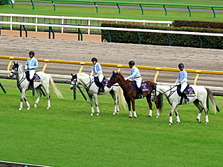 本日の 誘導馬。 メインレースを担当したのは ボスジラ、 レンディル、 マイネルラクリマ、 ミライヘノツバサでした。 |