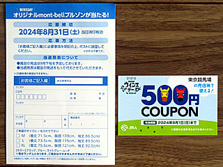 まずは「 ウインズデーUMACAでおトクな大抽選会」に参戦! UMAポートで抽選参加券が発行され、それと一緒に当日購入した1000円分の馬券を提示すると抽選会に参加できるというもの。 結果、C賞が当選し、Wチャンス応募ハガキと500円分の飲食クーポンをもらう。 |