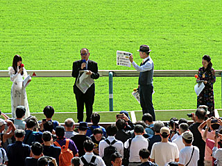 昼休み、ゴール前特設ステージにて「デイリースポーツ馬サブロー菊花賞検討会」と題したトークショーが行われました。 出演は 藤原菜々花さん、 小林正明さん、 木村拓人さん、 野里美央さん。 |