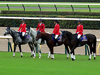 今日の 誘導馬。 メインレースを担当したのは サトノソルタス、 ボスジラ、 マイネルラクリマ、 デルマラピスラズリでした。 |