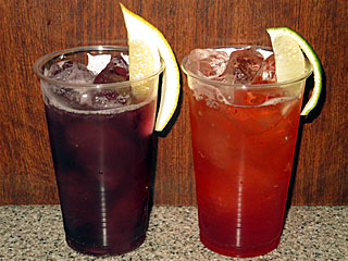 食後に フジビュースタンド3Fの 「BAR2400@TOKYO」へ。 枠色カクテルから2枠「 裸足のシンデレラ」と3枠「 3冠お嬢さん」を注文。 「裸足のシンデレラ」は、ジン+チェリーリキュール+ドライベルモット+ファンタグレープ+レモン、「3冠お嬢さん」は、ラズベリーリキュール+グレナデンシロップ+ジンジャーエール+ライムとのこと。 |