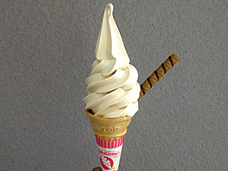食後に フジビュースタンド2Fの 「耕一路」へ。 来週、 イチローさんが来場するのに合わせて、今週から「 耕イチローモカソフトクリーム」を限定販売とのことで。 通常のモカソフトに、バットに見立てたチョコクレープロールを刺したもの。 お値段そのまま350円。 |