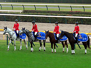 本日の 誘導馬。 メインレースを担当したのは ハヤブサナンデクン、 サトノソルタス、 マイネルラクリマ、 デルマラピスラズリでした。 |