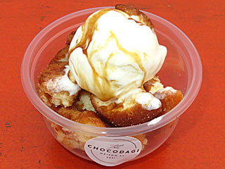 サーターアンダギーにバニラアイスを載せて黒蜜をかけたもの。