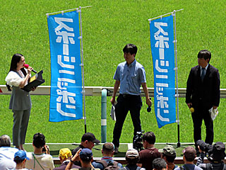昼休み、ゴール前特設ステージで行われた「 スポニチ安田記念前日予想検討会」が行われました。 出演は 飯本日菜子さん、 高木翔平さん、 鈴木悠貴さんとのこと。 |