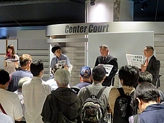 昼休み、 センターコートで「 スポーツ紙6社合同イベント予想検討会」が行われました。 スポーツ紙6社の内訳は、 日刊スポーツ、 スポーツニッポン、 デイリースポーツ、 スポーツ報知、 サンケイスポーツ、 東京スポーツ。 |