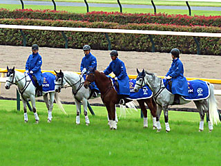 また、本日の 誘導馬。 メインレースを担当したのは ミライヘノツバサ、 シュガーヒル、 マイネルラクリマ、 ハナビマンカイでした。 |