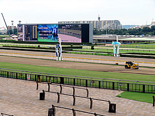 6月から工事が始まった パドックビジョンの工事。 液晶部分が剥がされ、工事用のシートで覆われていました。 |