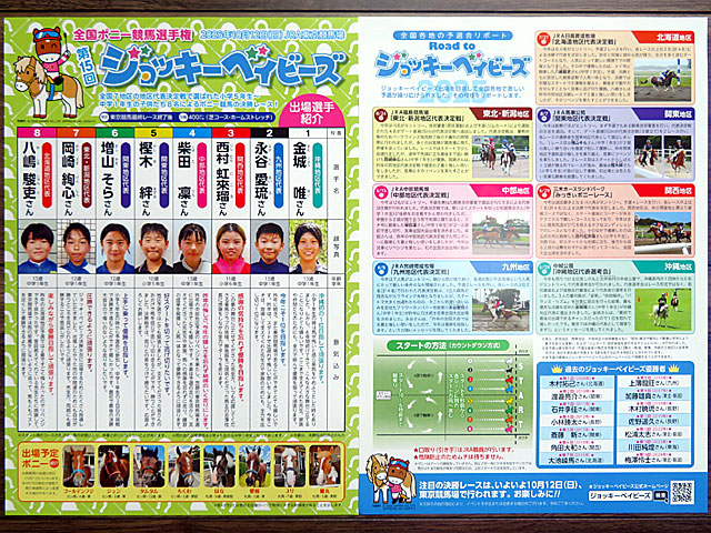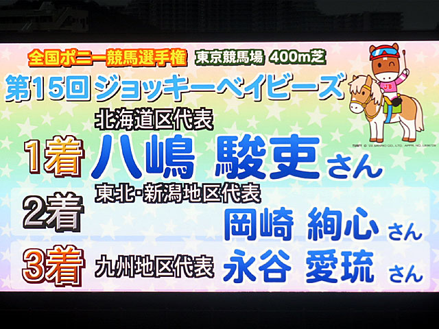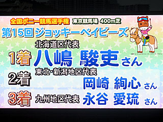 そして最終レース終了後、 全国ポニー競馬選手権「第14回 ジョッキーベイビーズ」が開催されました。 16:45頃に発走し、勝ったのは北海道地区代表の 八嶋駿吏くん& ユリ。 新潟千直?エイシンヒカリ?みたいに外ラチいっぱい! また、敢闘賞は沖縄地区代表の 金城唯さんが受賞。 |