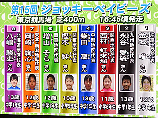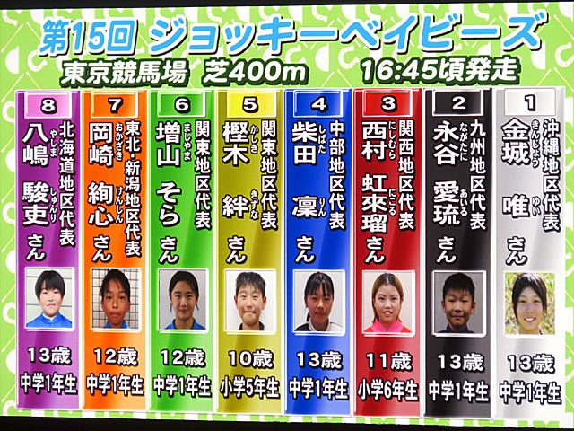 | 着順 | 馬番 | 馬名 | 性齢 | 騎手 | 学年 | 地区 | 時計 | | 1 | 8 | ユリ | 牝7 | 八嶋駿吏 | 中1 | 北海道 | 30.9 | | 2 | 7 | はな | 牝9 | 岡崎絢心 | 中1 | 東北新潟 | 5 | | 3 | 2 | タムタム | せん12 | 永谷愛琉 | 中1 | 九州 | 1 | | 4 | 6 | ちくわ | せん3 | 増山そら | 中1 | 関東 | 大差 | | 5 | 5 | ジュン | せん8 | 樫木絆 | 小5 | 関東 | クビ | | 6 | 3 | 蘭丸 | 牡5 | 西村虹來瑠 | 小6 | 関西 | 3 | | 7 | 4 | 愛桜 | 牝3 | 柴田凜 | 中1 | 中部 | 2.1/2 | | 8 | 1 | ゴールデンフジ | せん4 | 金城唯 | 中1 | 沖縄 | 8 |