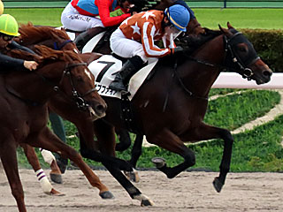 東京8Rは3歳上1勝クラス。芝2400m。 未勝利を勝った後、骨折のため戦列を離れていた アーモンドアイの初仔 アロンズロッドの復帰戦。 結果、1番人気に応えて2連勝! エピファネイア産駒の牡3で、鞍上は C.ルメール騎手。 |