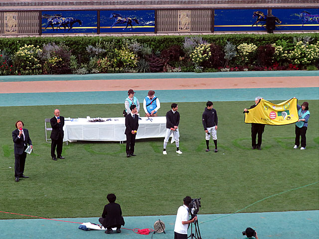 そして最終レース終了後、パドックにて「 サンクスホースデイズトークショー&チャリティーオークション」が行われました。 オークション出品者として登場したのは、 角居勝彦元調教師、 北村宏司騎手、 大野拓弥騎手、 野中悠太郎騎手。 |