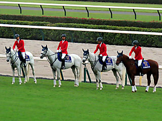 メインレースの 誘導馬。 今日は タケルペガサス、 サクセスミノル、 シュガーヒル、 マイネルラクリマが務めていました。 |
