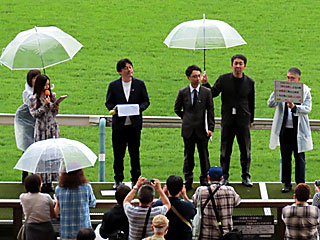 昼休み、ゴール前特設ステージで「 スポーツ報知秋華賞予想検討会」と題したトークショーが行われました。 出演は 大塩由起さん、 大上賢一郎さん、 浅子祐貴さん、 馬トクスタッフとのこと。 |